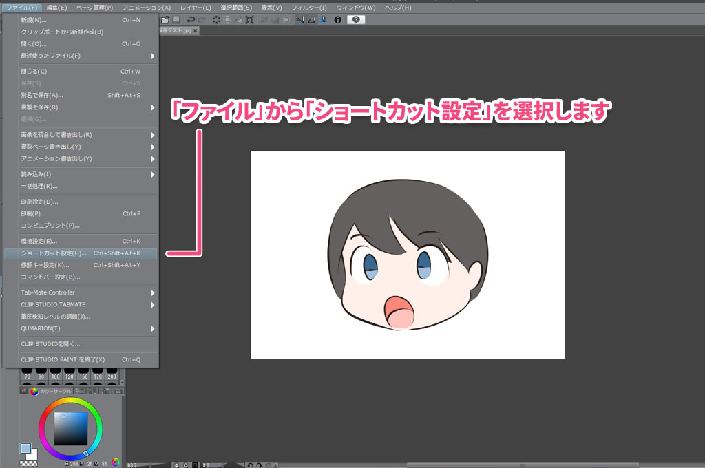まず「ファイル」→「ショートカット設定」を開きます。