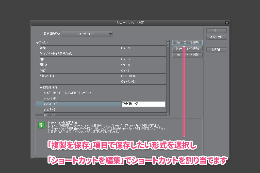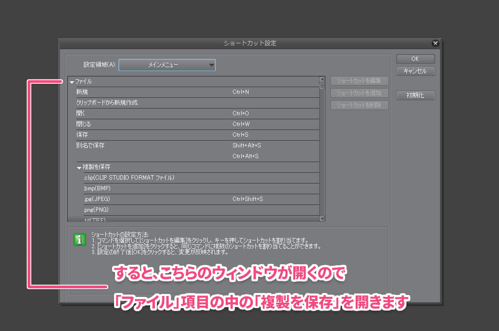 クリスタの「複製を保存」に「Shift+Ctrl+S」のショートカットを割り当てる